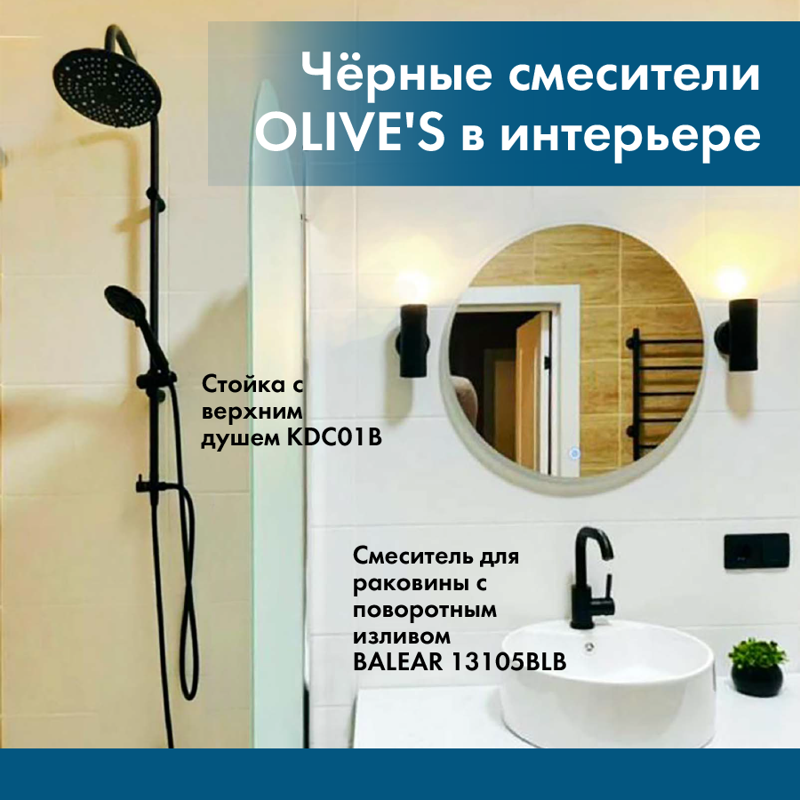 Элегантные и стильные черные смесители и душевые стойки OLIVE’S идеально впишутся в интерьеры с белыми стенами, белыми раковинами и ванными, контрасты черного и белого создадут цветовые акценты и динамичность всей композиции.